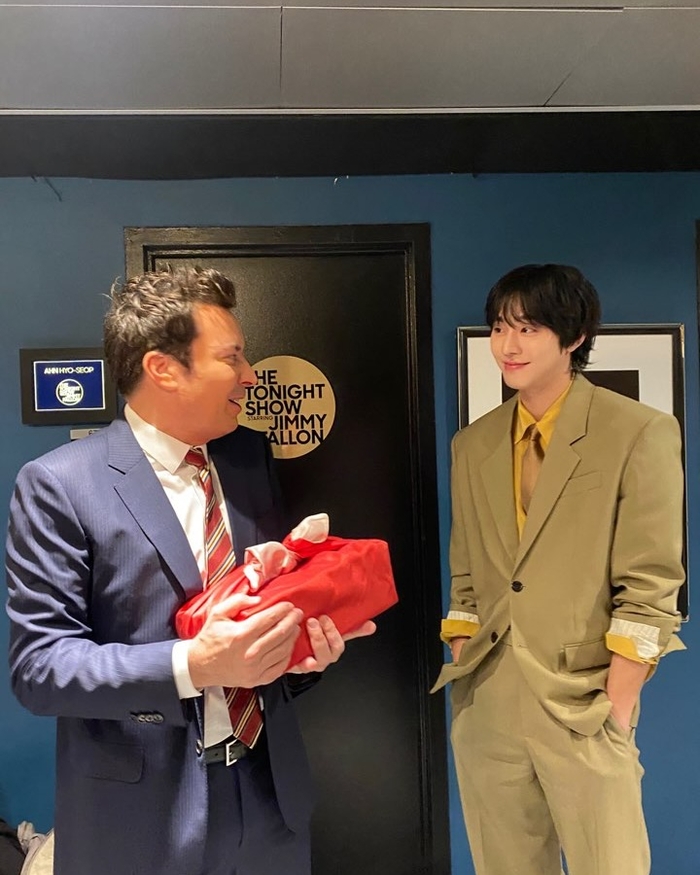 Following the broadcast, Ahn Hyo-seop shared exclusive behind-the-scenes glimpses on his social media, accompanied by a heartfelt “Jimmy Fallon ♥” caption. The photos resonated deeply with fans, showing him confidently posing against “The Tonight Show” logo, striking a chic pose in the waiting room, and engaging in a warm exchange of gifts with Jimmy Fallon himself. These curated posts amplify his organic connection with a major global platform, turning a broadcast appearance into a multi-channel digital event.