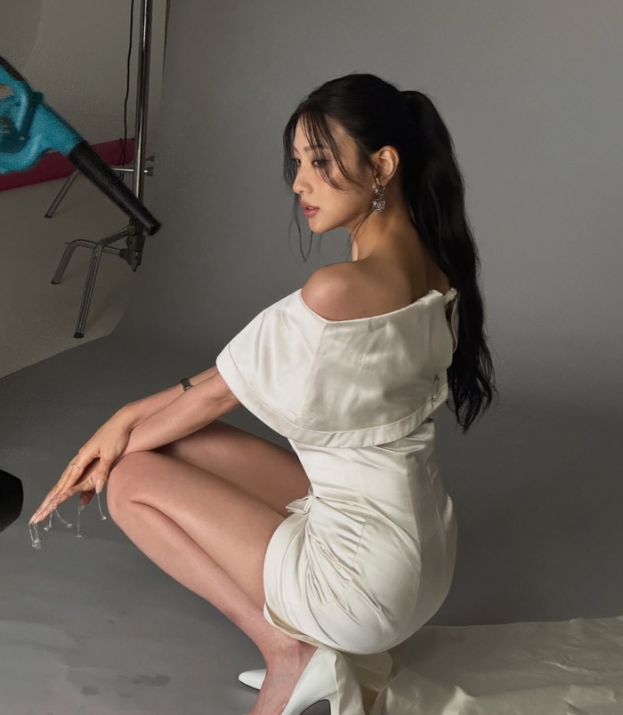 Hayoung’s diverse visual range in these photos is truly remarkable, projecting a multifaceted persona perfectly poised for live stages. We see her exuding elegance in a pristine white off-shoulder dress, gracefully showcasing her shoulder line. Then, she effortlessly transitions to a fresh, vibrant charm, sporting a casual tee emblazoned with the very title of the track, ‘LOVE ME MORE’. Yet another shot reveals a languid, captivating allure as she poses in a rich brown sequin top, asserting her unique and undeniable visual dominance.