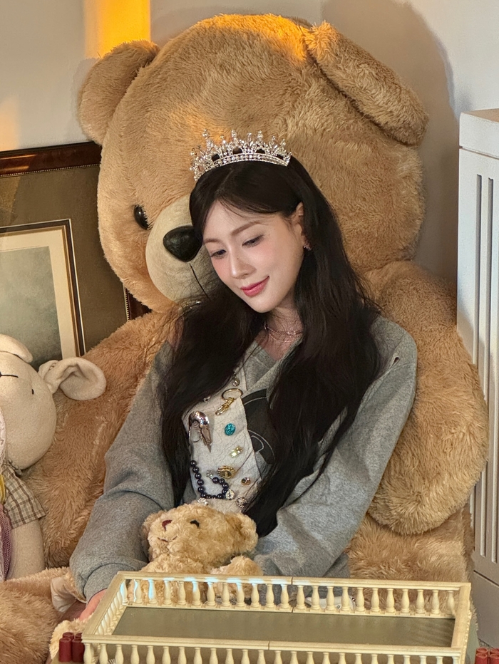 What truly caught our eye was the audacious styling choices for this comeback, promising an enthralling spectacle on stage. Hayoung flawlessly embodied a doll-like beauty, complete with mysterious blue colored lenses, delicate freckle makeup, and intricate nail art. One particularly enchanting image captures her beside a colossal teddy bear, wearing a tiara and a sweet smile, evoking the whimsical charm of a fairy tale protagonist – a concept that undoubtedly elevates the entire performance aesthetic.