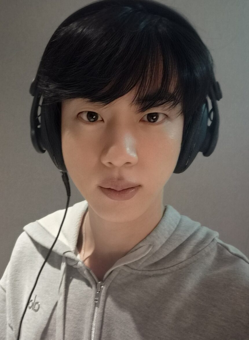 On **December 29**, our beloved Jin unwrapped an early New Year’s gift for us all via the global fan community Weverse: a selfie that perfectly encapsulates his “forever prime” status. Captured in what appears to be a recording studio, Jin donned an effortlessly chic grey hoodie zip-up jacket from the popular U.S. brand **ALO**. With headphones adorning his head, the scene suggested that magic, in the form of his crystal-clear vocals, was perhaps being created.