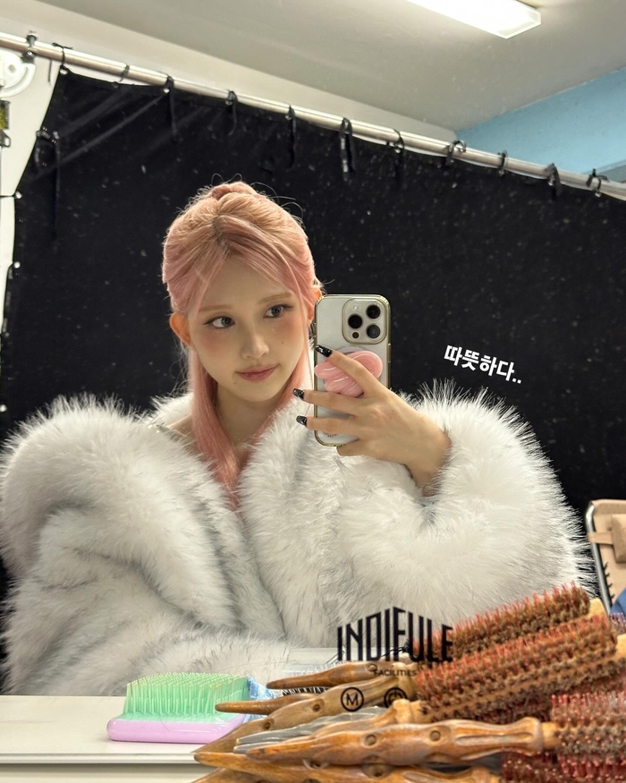 The behind-the-scenes glimpses from the ‘BANG BANG‘ music video, a pre-release from IVE‘s 2nd full album, ‘REVIVE+‘, reveal Gaeul in a stunning visual evolution. Her audacious pink hair is flawlessly executed, showcasing a captivating visual transformation that feels straight out of a cinematic masterpiece. Her styling felt like a beautifully crafted scene, effortlessly blending a rebellious Y2K flair with an undeniable, endearing charm.