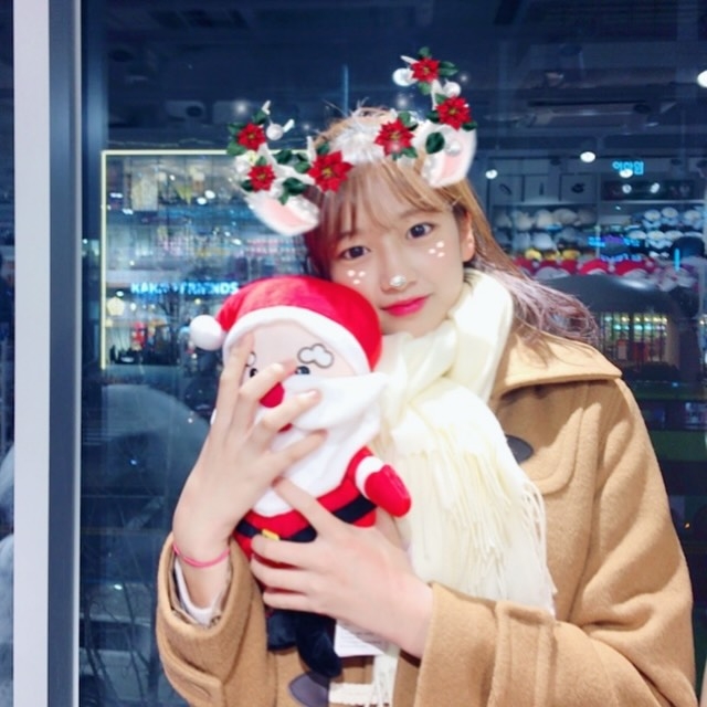 • 🎄 Festive Fun: Wearing a reindeer headband and embracing a Santa doll, perfectly capturing the Christmas spirit.