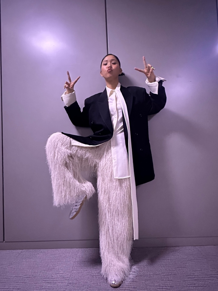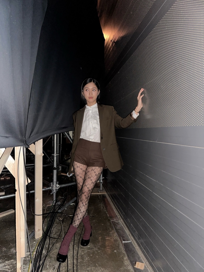 Meanwhile, the photo dump wasn’t just limited to her ballet transformation. **Mimi** also treated fans to a display of her diverse fashion sensibilities. In a striking contrast to her ballet attire, another set of images shows her in what appears to be a backstage setting, rocking a **chic brown jacket**, **trendy short shorts**, and eye-catching **patterned tights**. This look presented a more sophisticated and hip vibe, showcasing her ability to transition seamlessly from ethereal ballerina to a fashion-forward icon. Her playful winks and charismatic poses further cemented her reputation as an idol of multifaceted charms.