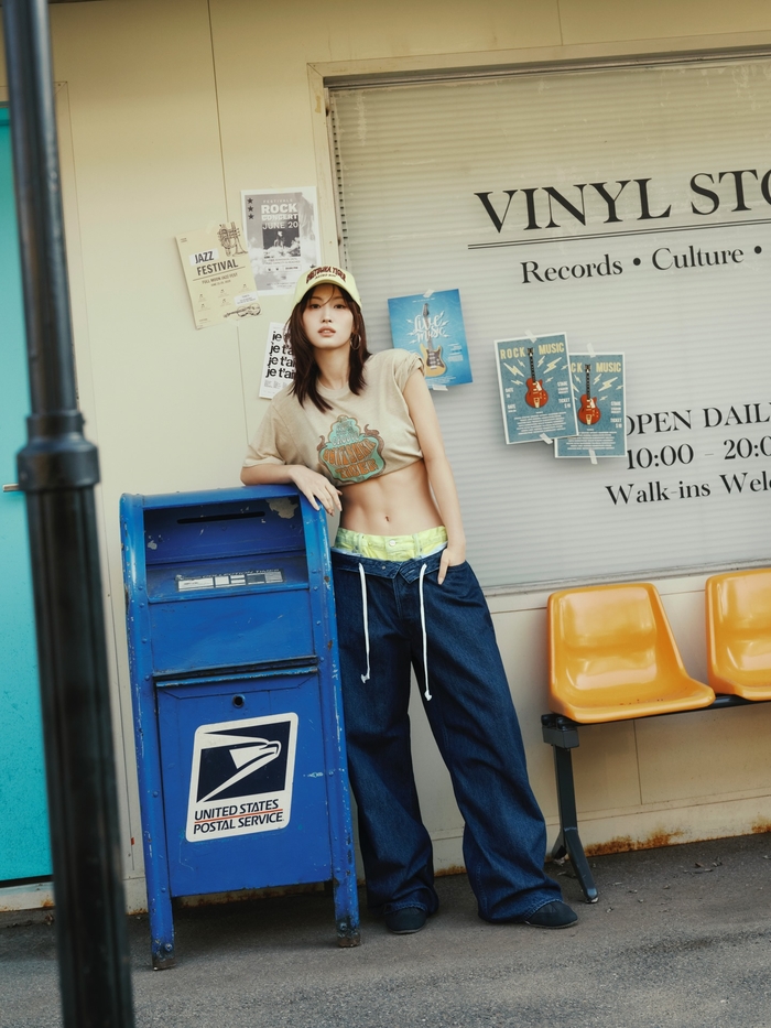 The pictorial frames Momo against a backdrop steeped in vintage allure – a charming LP shop and a classic mailbox, lending a timeless, wistful mood to the entire concept. Yet, it’s her modern interpretation of style that truly shines through.