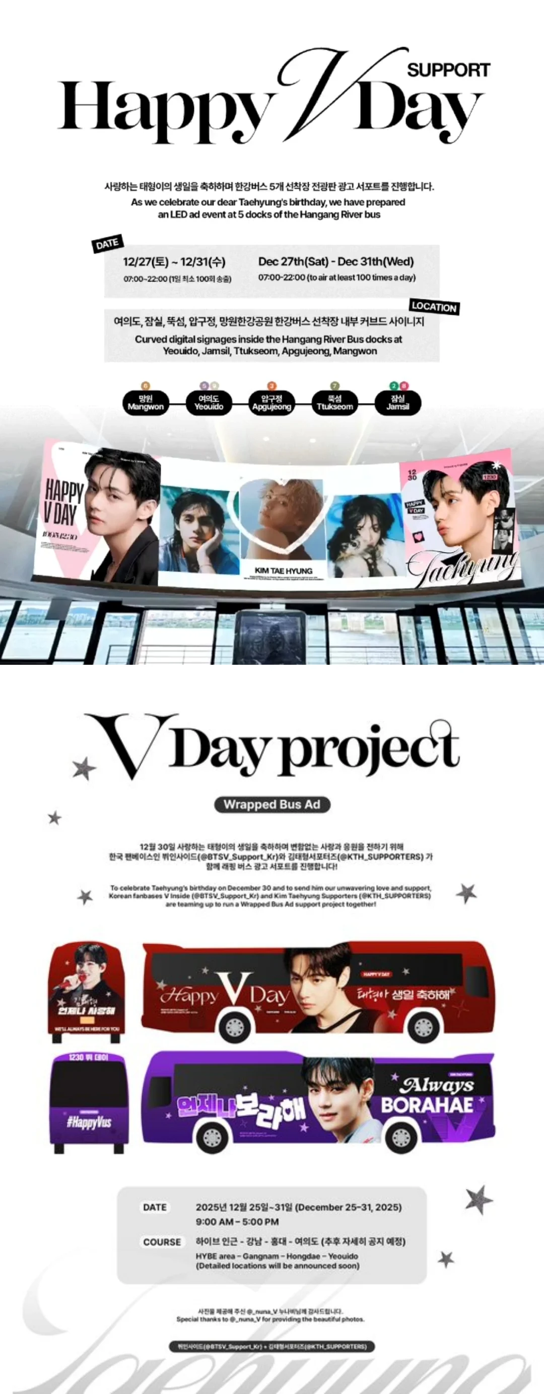 Pesta belum usai! Dari 25 sampai 31 Desember, V INSIDE dan Kim Taehyung Supporters Korea kerja bareng bikin iklan di bus keliling. Bus-bus ini bakal muter di sekitar gedung HYBE, Gangnam, Hongdae, dan Yeouido. Plus, Kim Taehyung Supporters Korea juga pasang iklan di shelter taksi depan gedung HYBE selama sebulan penuh di Desember. Dan tim Team Taehyung? Mereka bakal tayangin video ultah di LED raksasa Superior Tower Samsung Station dari 27 sampai 30 Desember. Seoul benar-benar jadi galeri Taehyung! 💣💥