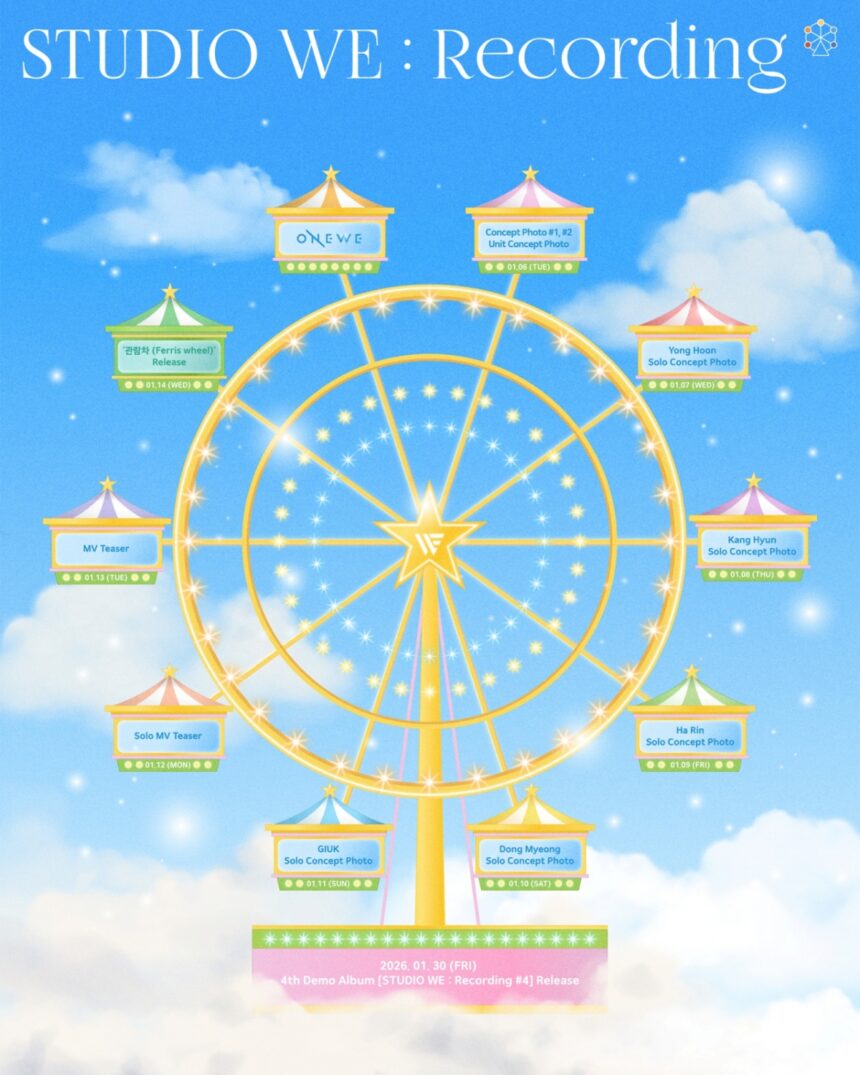 Get ready to immerse yourself in ONEWE‘s world this month! The digital single ‘Ferris wheel‘ will be available on all major music platforms starting January 14 at 6 PM KST, followed by the physical release of ‘STUDIO WE : Recording #4‘ on January 30.