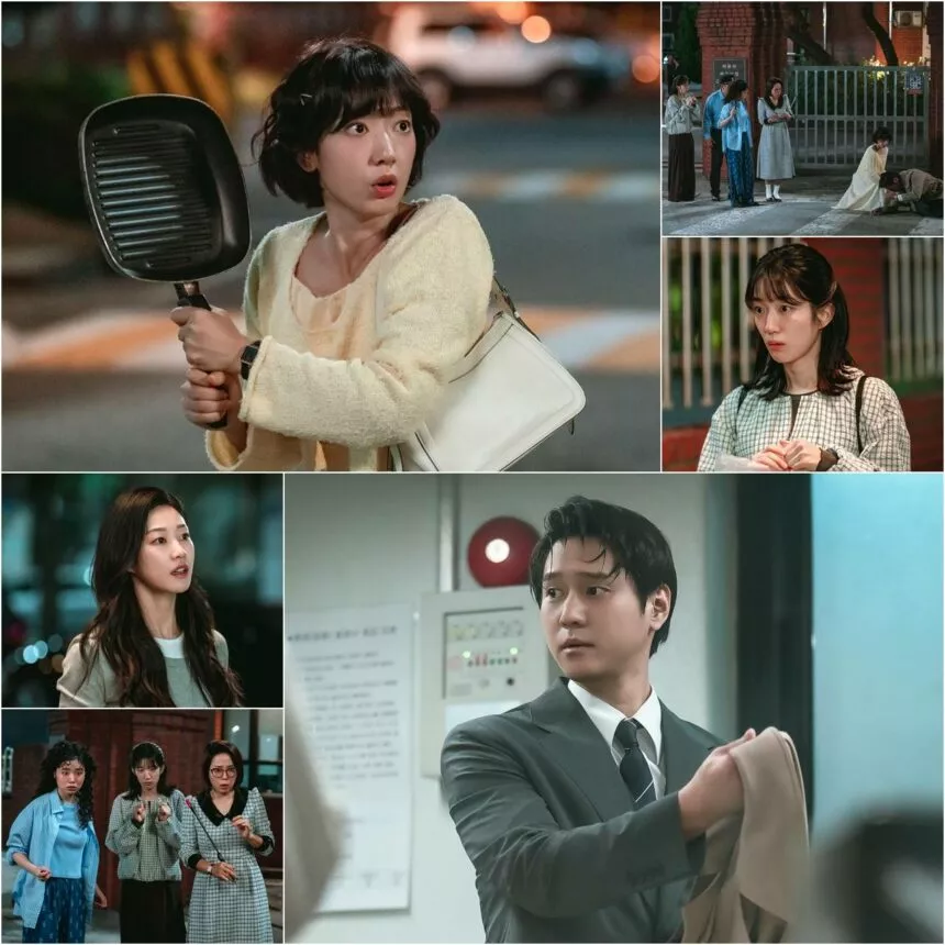 The latest stills reveal a truly unforgettable moment: Hong Geum-bo (Park Shin-hye) momentarily pauses, wielding a frying pan, while Shin Jeong-woo (Go Kyung-pyo) lies sprawled on the floor. This dramatic turn of events unfolds right in front of the 301-roommates, Kang No-ra (Choi Ji-soo) and Kim Mi-sook (Kang Chae-young), who rush out to witness the chaos. Adding to the delightful pandemonium, even the dorm warden and security guard are left bewildered, while Go Bok-hee (Ha Yoon-kyung) appears to grasp the entirety of the situation. This lively commotion outside the dormitory gate immediately sparks curiosity about the full narrative behind this explosive scene.