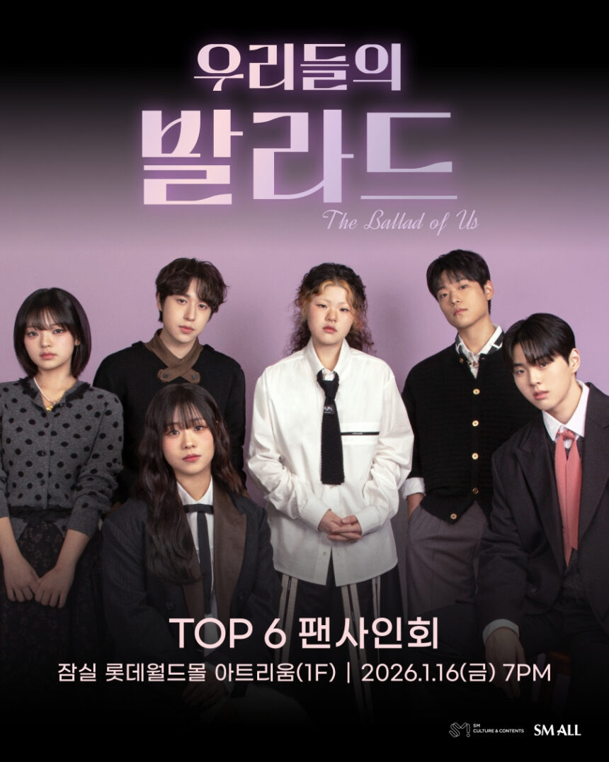 The melodious magic of SBS’s hit audition program, ‘Our Ballad,’ continues to resonate across Korea! Following the show’s heartfelt conclusion last month, the highly anticipated TOP6 — comprised of vocal powerhouses Song Ji-woo, Lee Ye-ji, Lee Ji-hoon, Cheon Beom-seok, Choi Eun-bin, and Hong Seung-min — are set to meet their devoted fans face-to-face. Get ready, Seoul, because a special event is coming your way!