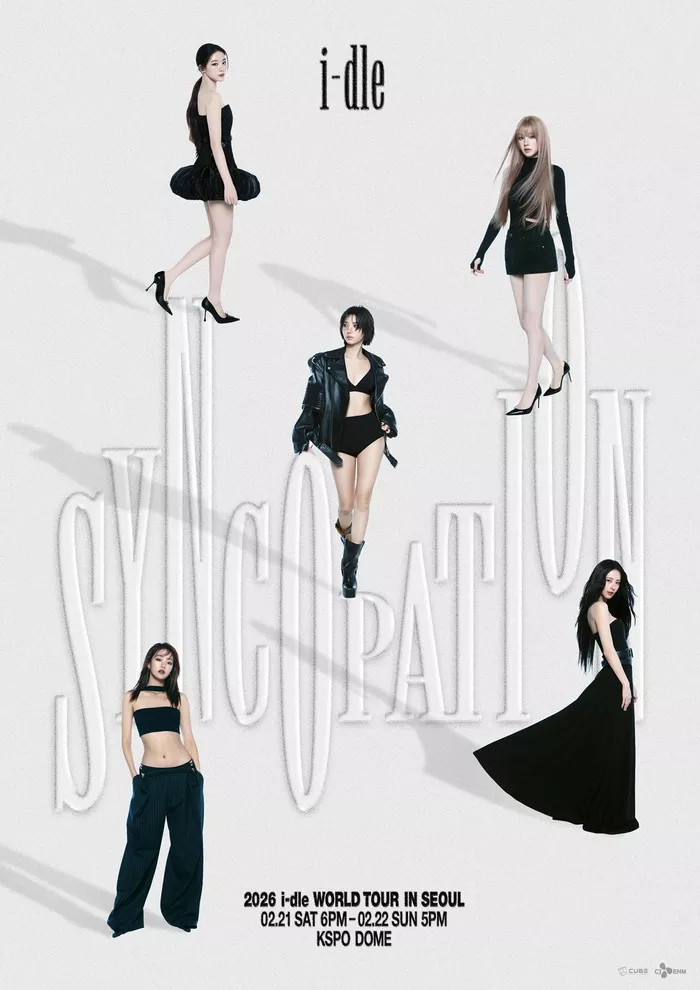 Vào ngày 16 tháng 1, công ty chủ quản Cube Entertainment đã tung poster chính thức cho ‘2026 (G)I-DLE WORLD TOUR [Syncopation] IN SEOUL’ thông qua các kênh SNS chính thức. Hình ảnh quá sức là một kiệt tác kể chuyện bằng hình ảnh, ngay lập tức lôi cuốn người xem vào thế giới ý tưởng của tour diễn. Poster có sự xuất hiện của các thành viên (G)I-DLE (Miyeon, Minnie, Soyeon, Yuqi, và Shuhua) toát lên vẻ đẹp hiện đại, sang chảnh trên nền trắng tinh khôi, tất cả đều được tạo hình hoàn hảo trong trang phục toàn màu đen. Trước đó chỉ được nhá hàng bằng những bóng hình bí ẩn, giờ đây họ đã xuất hiện trọn vẹn, thể hiện trực quan sự căng thẳng nhịp nhàng như chính tên gọi của tour diễn, ‘Syncopation.’
