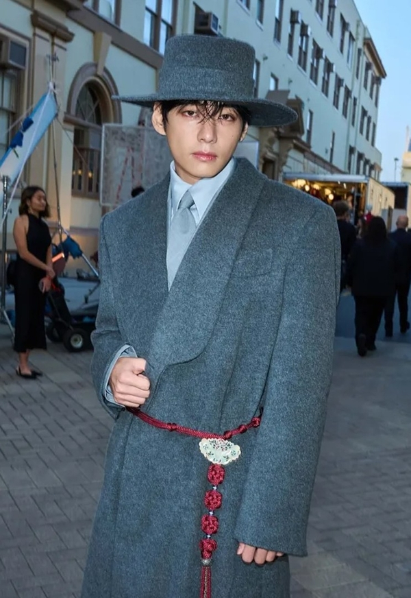 Speaking of Celine, V’s role as a global ambassador since **2023** has truly solidified his status. He doesn’t just wear Celine; he inhabits it, making each piece uniquely his own. From his bold **leopard scarf-pointed double suit** at the **LA Tiltil Ambassador event** on **November 14th** to the iconic **long overcoat and wide hat** at the **LA Fashion Show** on **October 26th**, V consistently pushes boundaries, delivering unforgettable looks that could easily be pulled from a high-fashion movie set.
